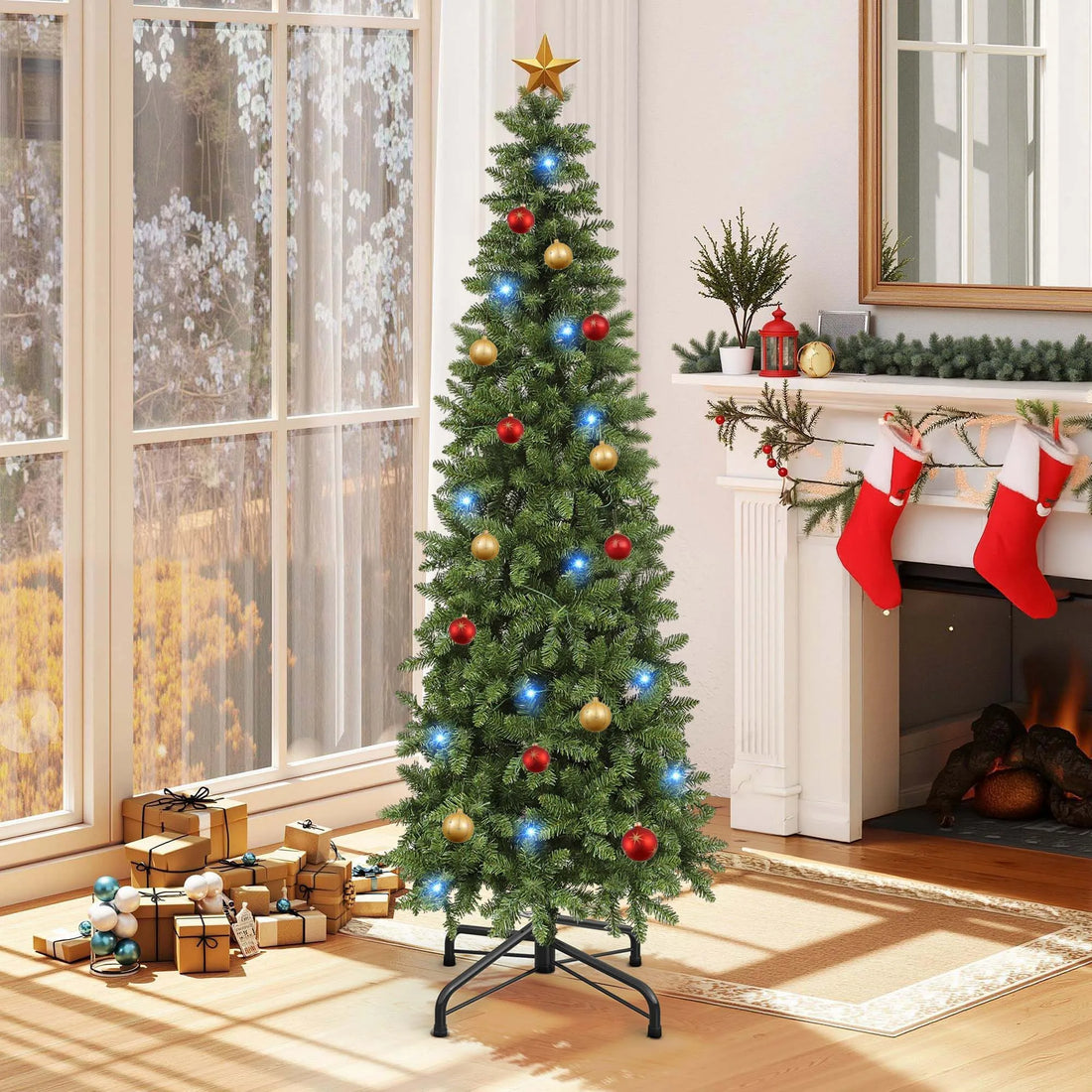 Balconera 6ft Pre-Lit Pencil Christmas Tree - Slim Fraser Fir with 700 Tips & 200 Lights for Home/Office/Party, Green