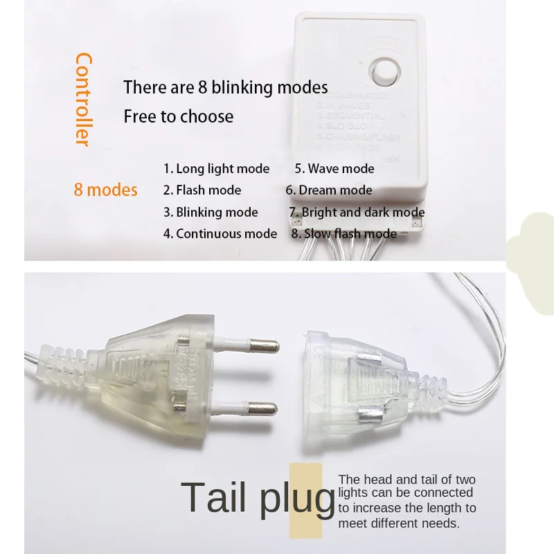 8 mode controllers: 1. Constant light mode 2. Flash mode 3. Flash mode 4. Continuous mode 5. Wave mode 6. Fantasy mode 7. Extinction mode 8. Slow flash mode
