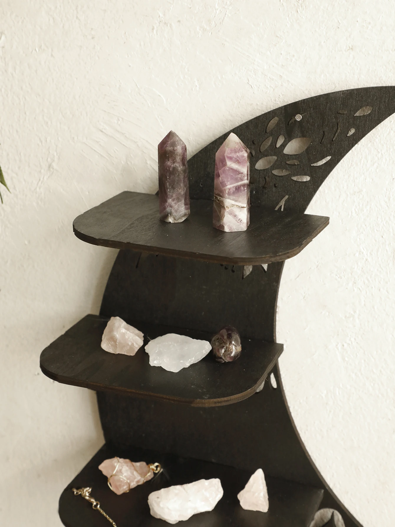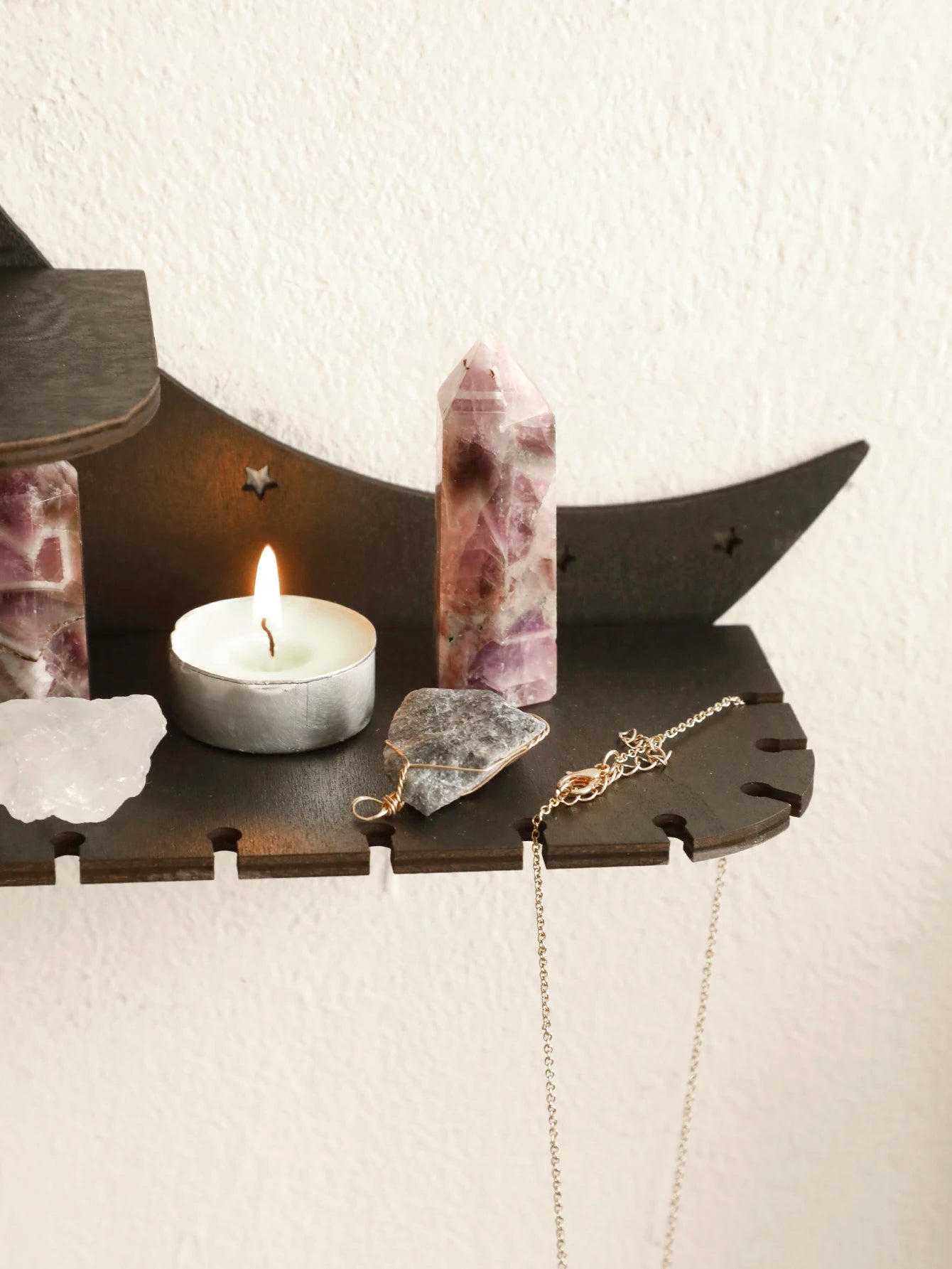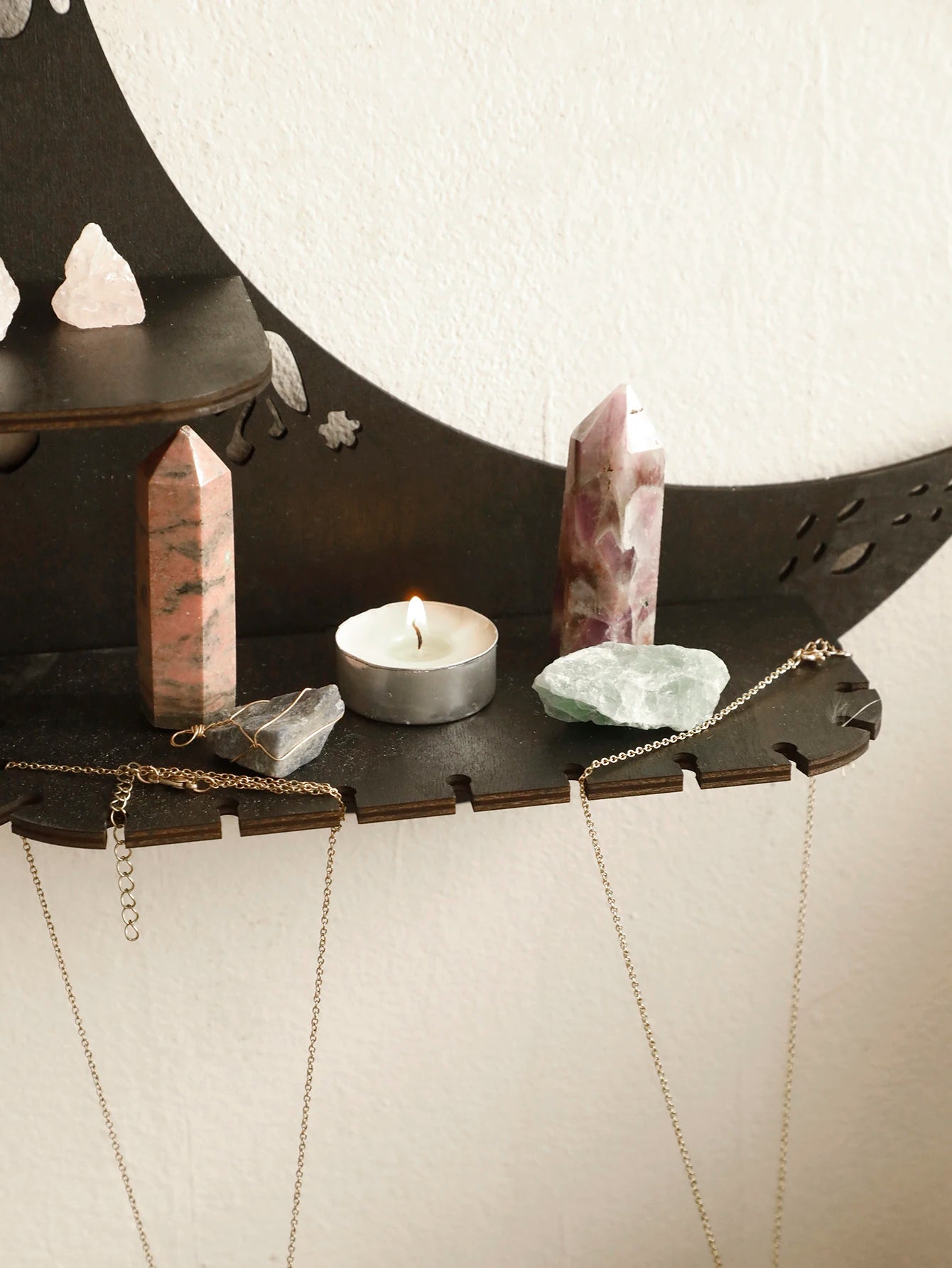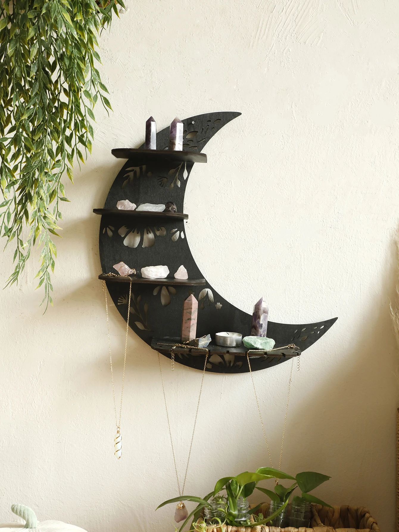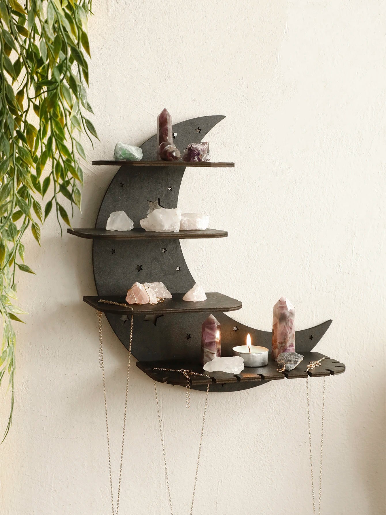 30/39cm Black Moon Wall Shelves 4-tier Wood Floating Wall Shelf Gothic Home Decor Crystal Shelf Display Ledge Essential Oil Rack
