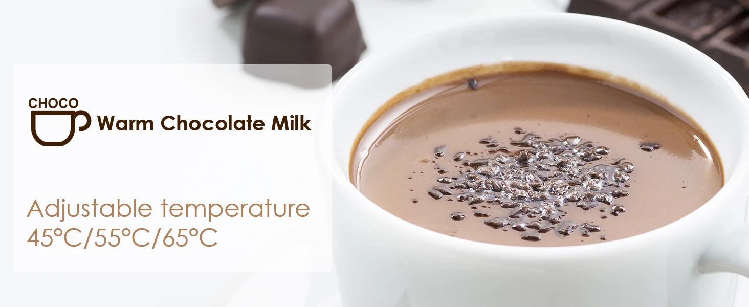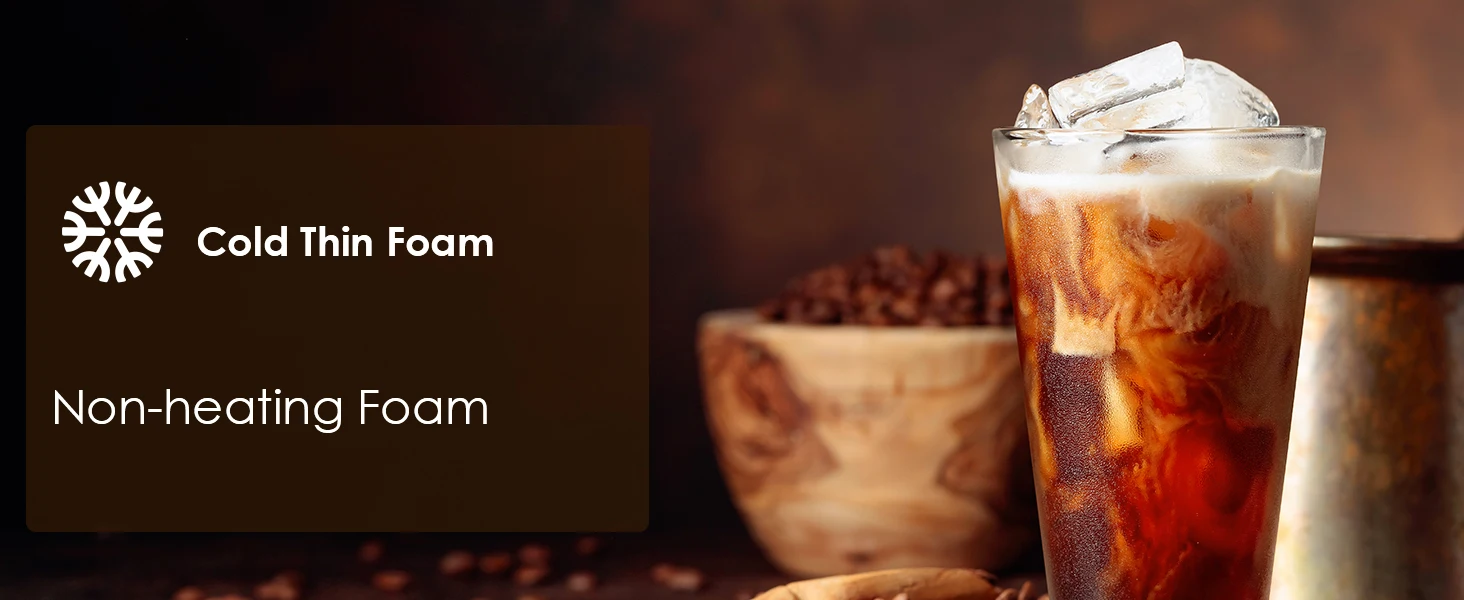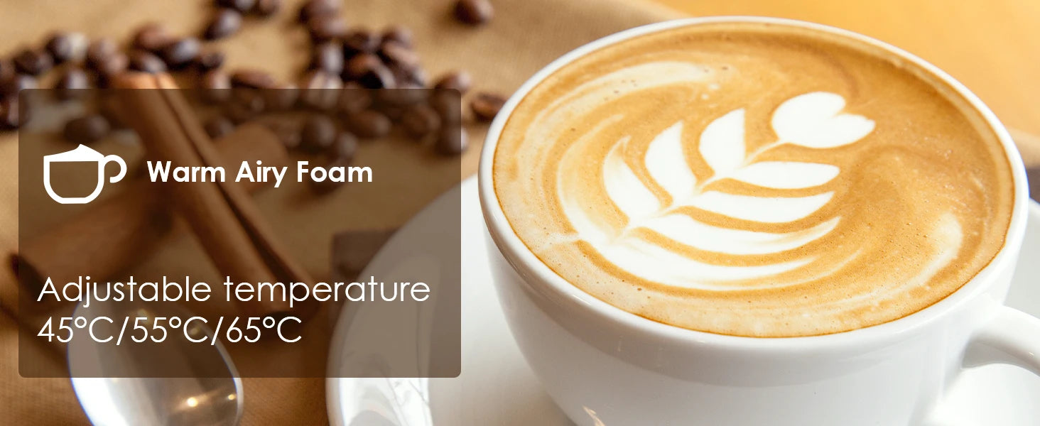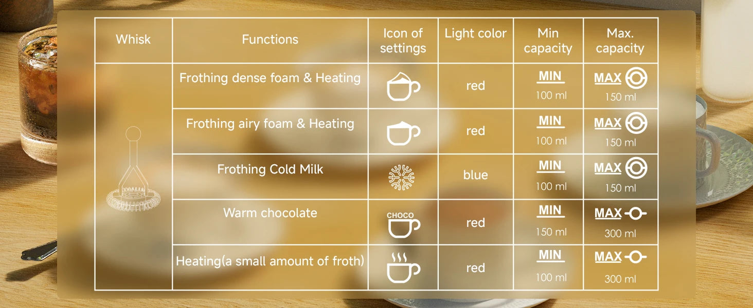 1. 5-in-1 Function: ①Hot Dense Foam ②Hot Airy Foam ③Warm Chocolate Milk ④Warm Milk ⑤Cold Thin Foam. It’s best to use whole milk (fat content > 3%) for optimal frothing.