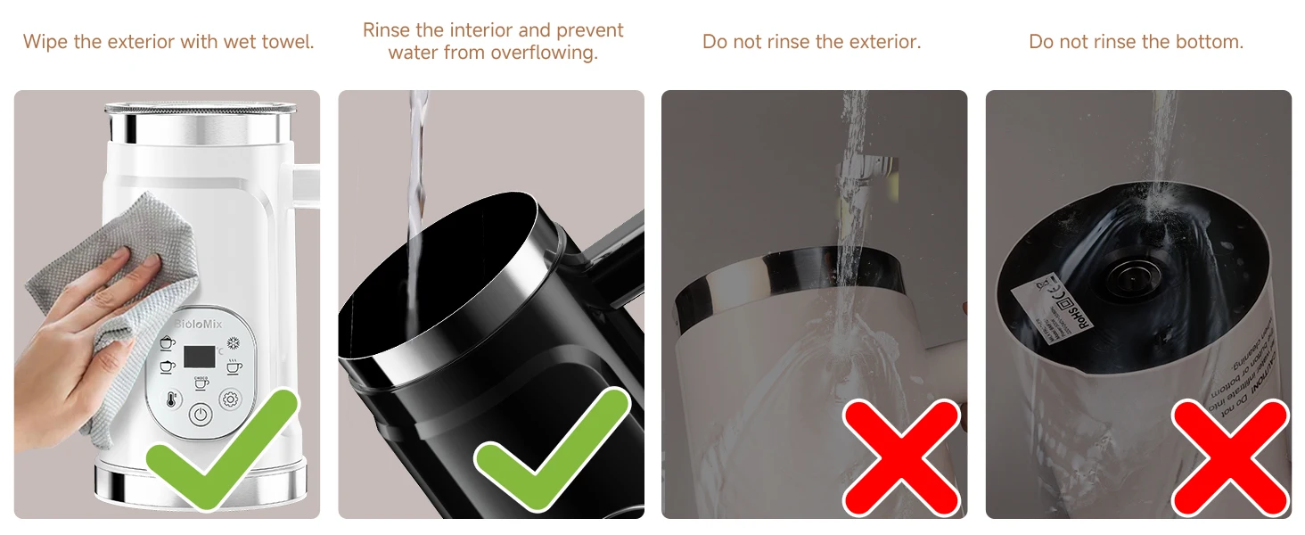 5. Easy to Clean: The frother has an ABS housing and a non-stick stainless steel interior, making it easy to clean with a damp cloth. Avoid submerging the unit in water.