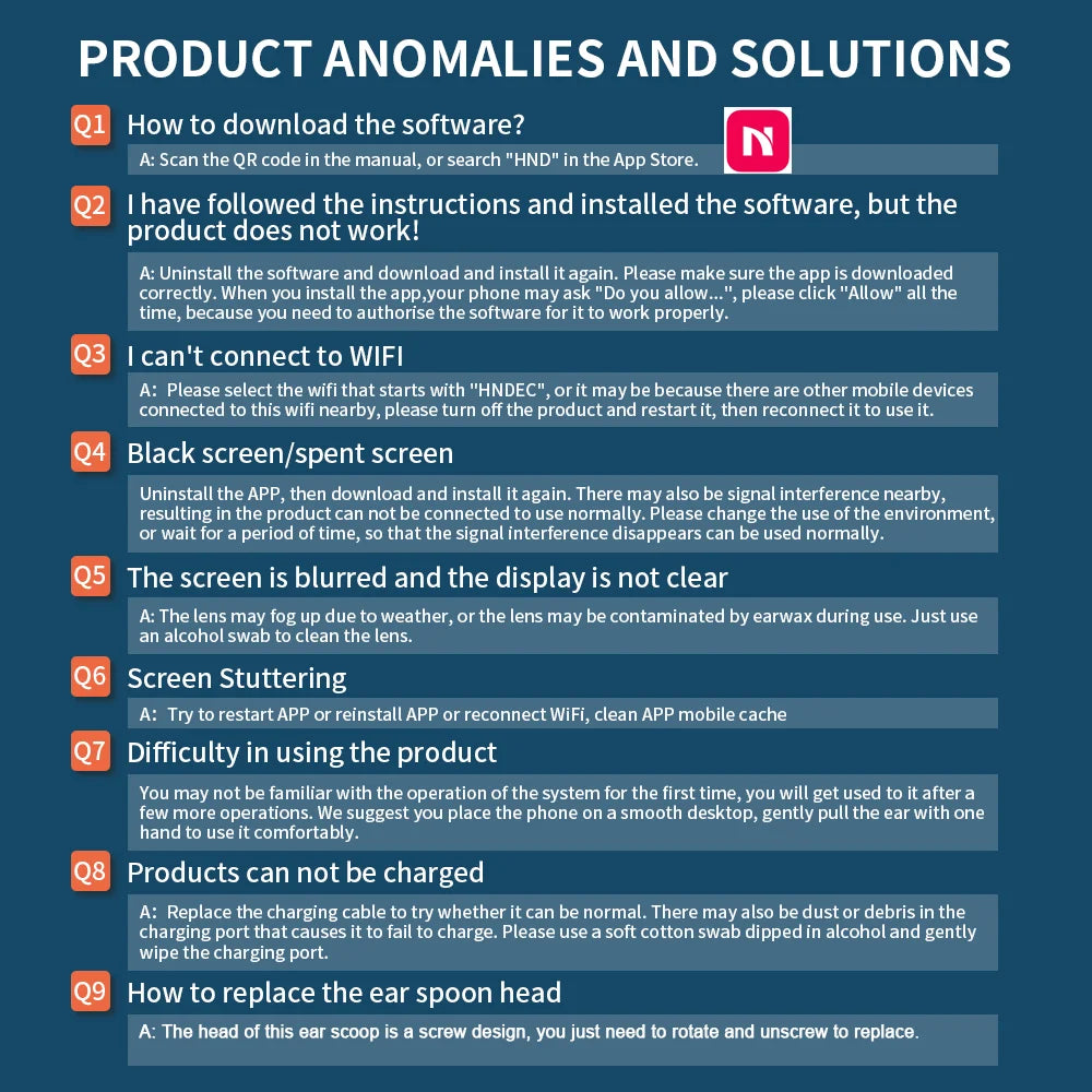 【Easy to Use & Wide Compatibility 】 Scan QR code on manual ,Download and install the APP on your device, Press and hold the power button on top of device to turn on the ear cleaning rod and then connect WiFi(Name :HNDEC-xxxx) with your device .The APP works with all of Android smartphone / tablet and IOS iPhone / iPad.
