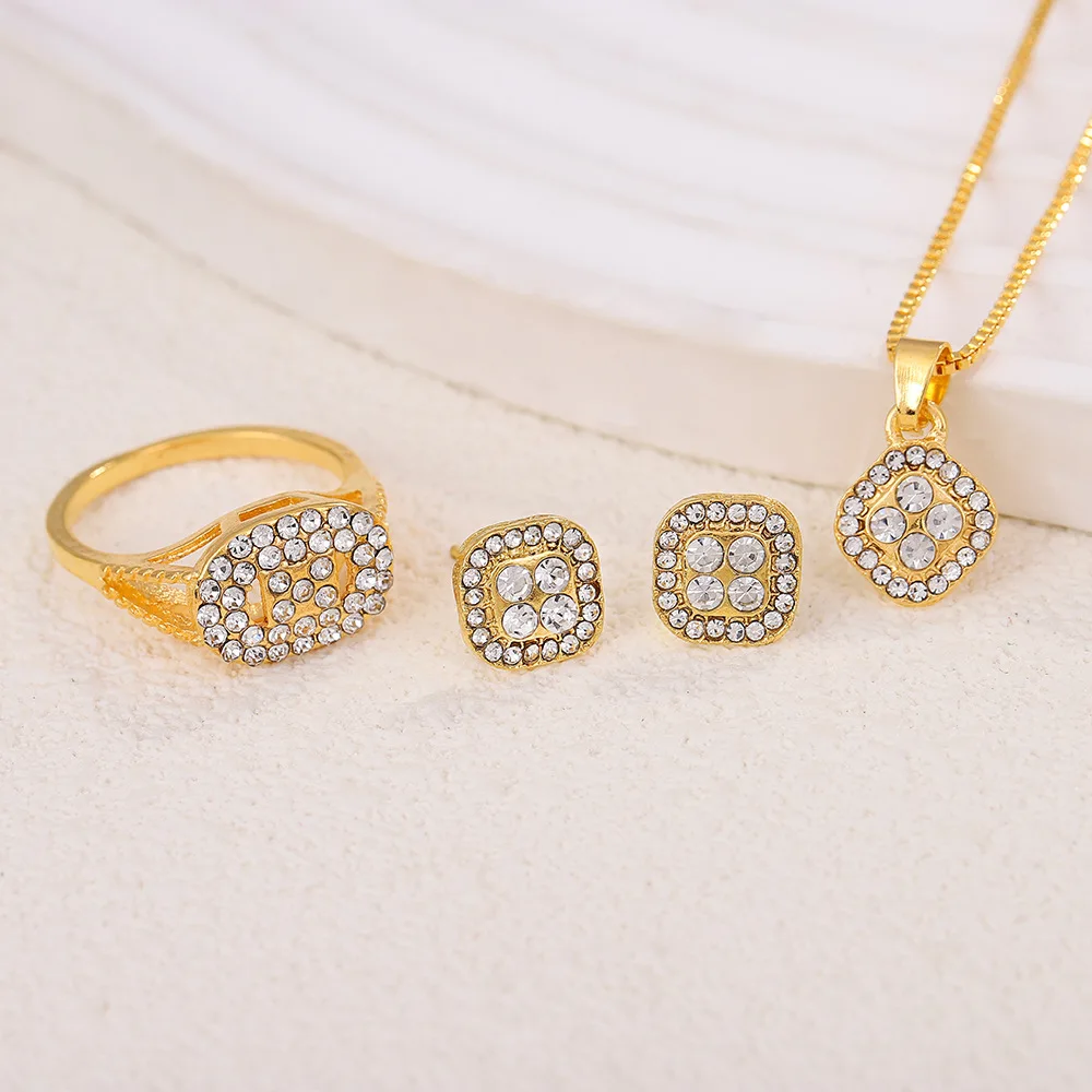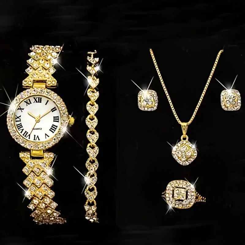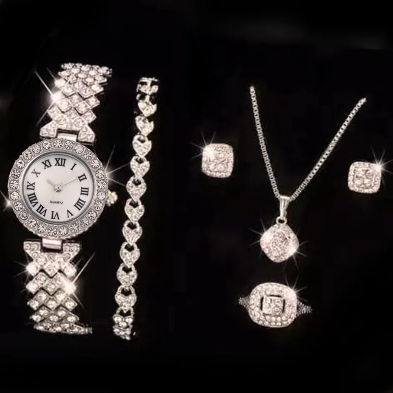Fashion Luxury Full Crystal 5 Pcs Watch Necklace Earrings Ring Set for Women Rhinestone Wristwatch Female Bracelet Set Gift