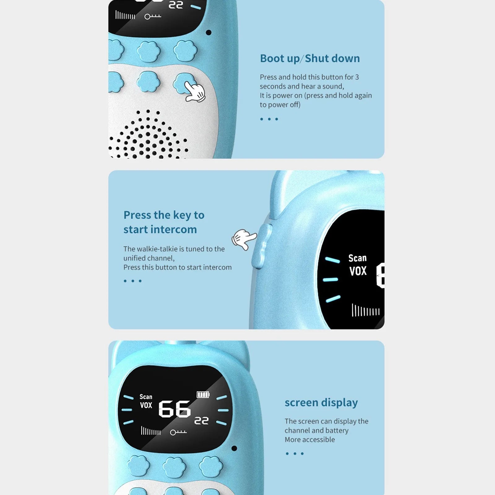 With minimal buttons and a straightforward interface, our walkie talkies are very easy to operate, even for young children.
