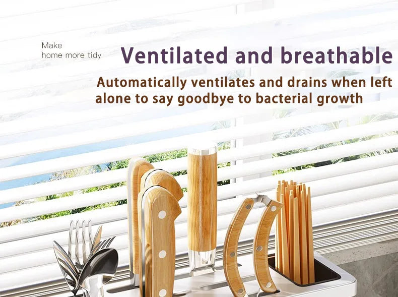 This knife holder is very suitable for kitchen storage. It is suitable for all large and small knives. It is moisture-proof and rust-proof, thickened material, large capacity, partitioned storage. It can store 8 kinds of various knives. The frame has protective baffles to avoid accidental injuries when picking and placing, and is quiet. It can be automatically ventilated and drained to say goodbye to bacterial growth. It has a hidden chopstick holder and a removable hook. I hope you will like it.