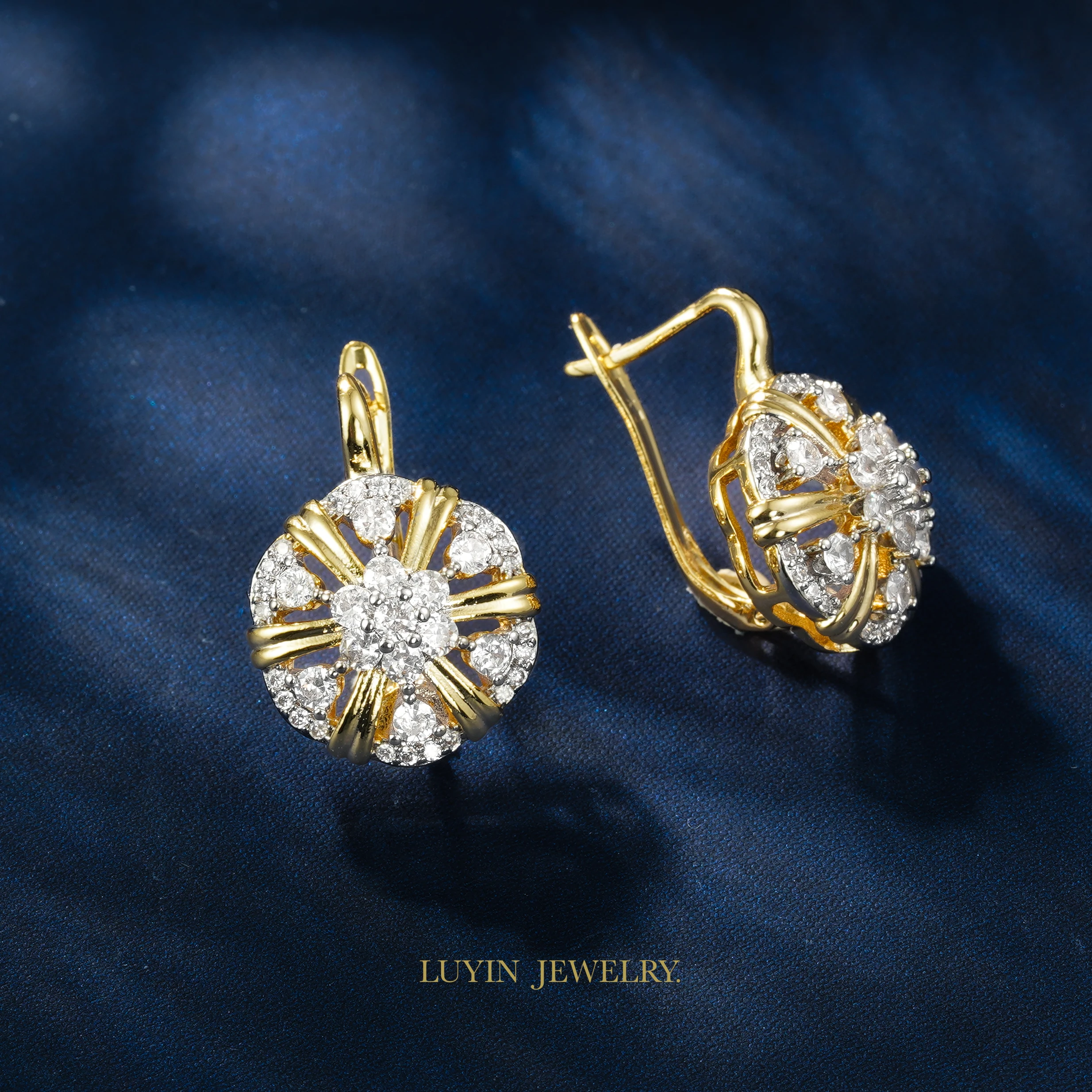 LUYIN New Arrival Floral Series Brilliant Inlaid Zircon Earrings Ring Set For Women Copper Plated 14K Gold Color Wedding Gifts