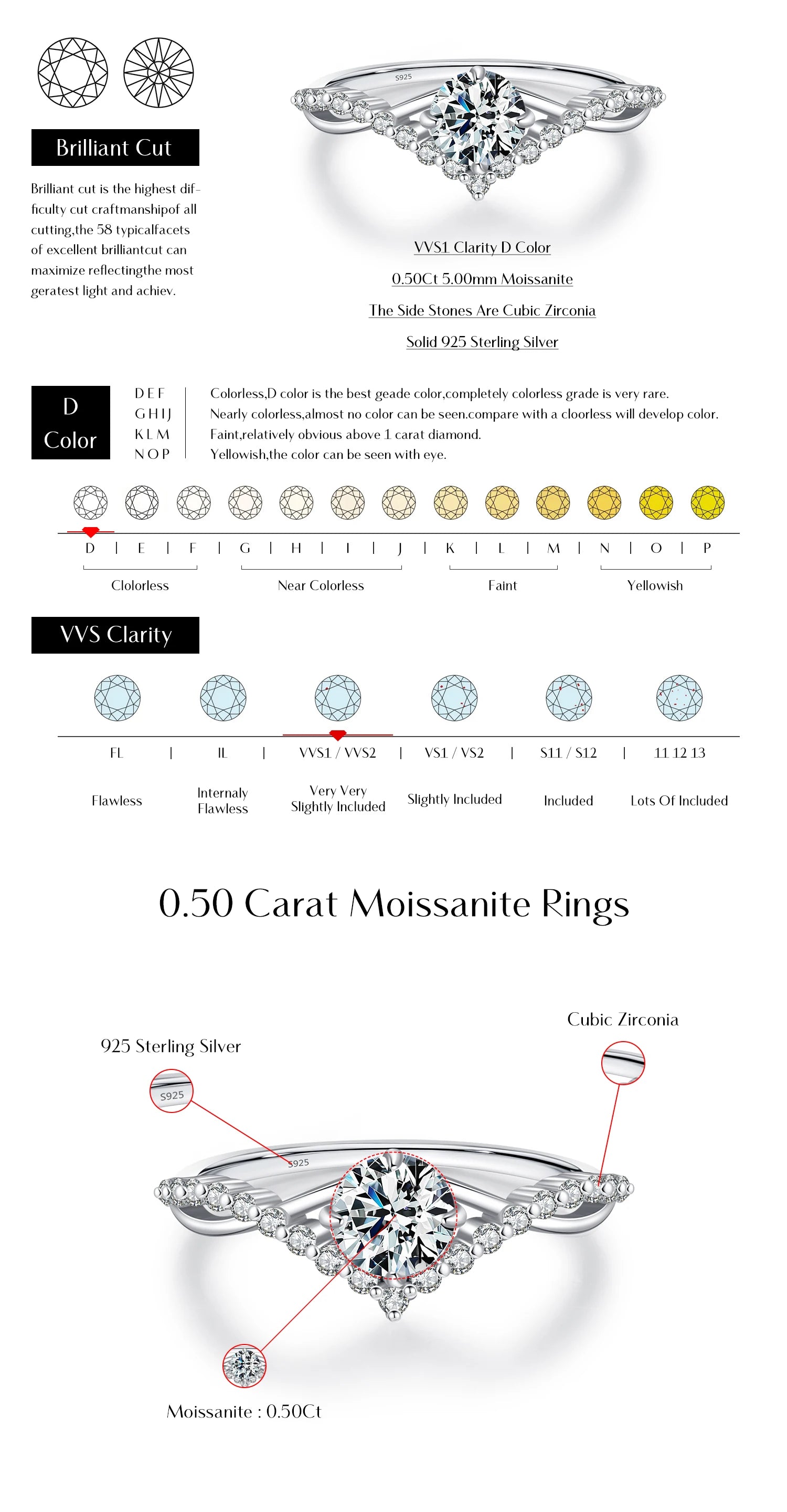 Ring Main Stone Weight/Pieces:Moissanite Diamond 0.50 Carat