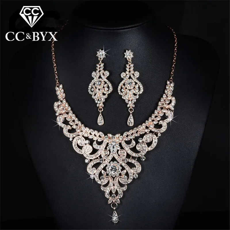 Rose Gold Color Bridal Jewelry Sets CZ Austrian Crystal Necklace Earring Sets Luxury Jewelry Bijoux Femme D020
