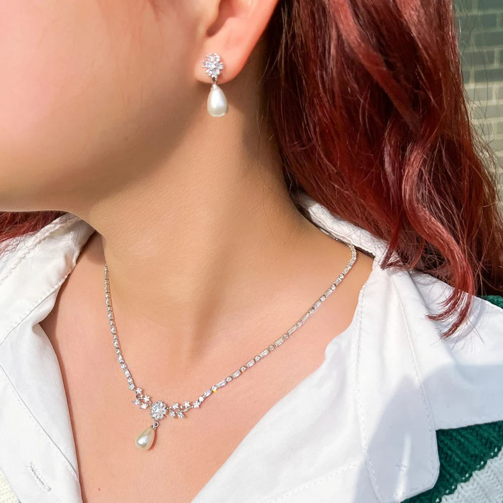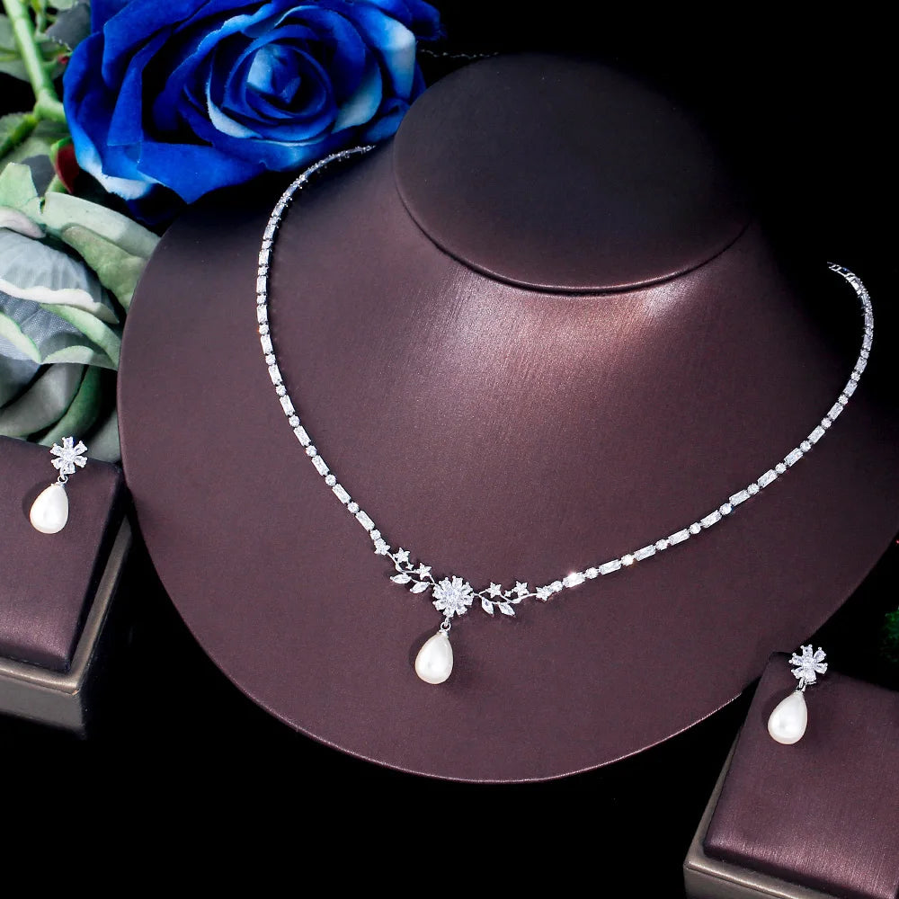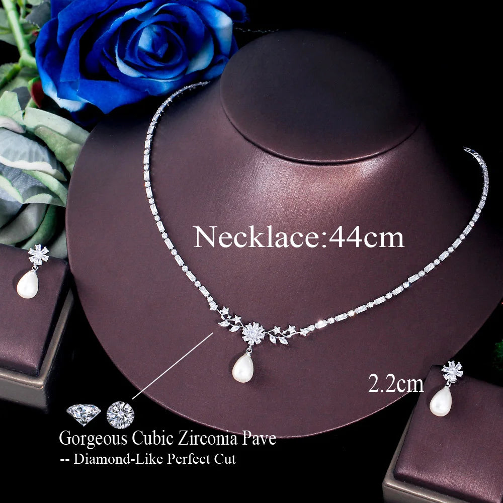 ThreeGraces Shining Cubic Zirconia Silver Color Simulated Pearl Earrings Necklace Fashion Flower CZ Jewelry Set for Women TZ839