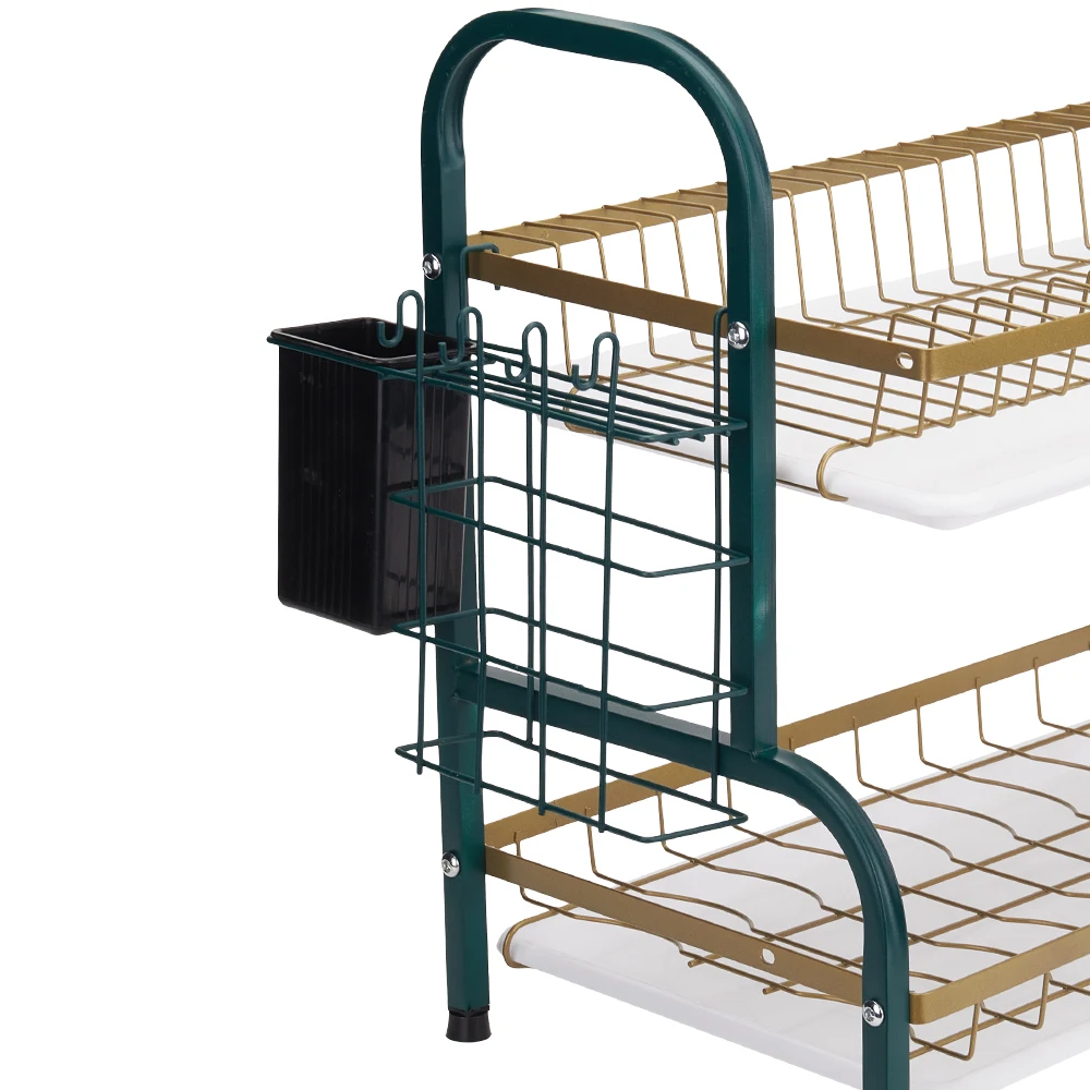 Revolutionize your kitchen organization with our innovative Double-Layer Dish Rack. This sleek and efficient rack not only offers ample space for drying dishes but also comes with a cutlery holder, knife holder, and pot lid holder for added convenience. Crafted from high-quality carbon steel and coated in elegant green and gold hues, it is both rust-proof and corrosion-resistant, ensuring long-lasting durability without deformation.